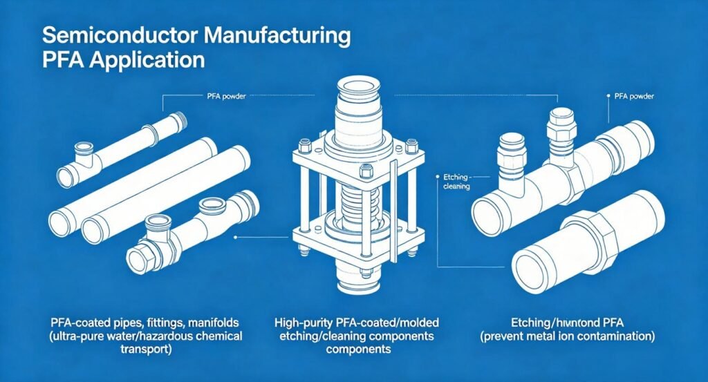 Due to its ultra-high purity and resistance to fluorinated acids, PFA powder is critical for “clean” environments.
