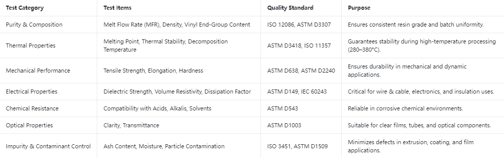 Our FEP (Fluorinated Ethylene Propylene) resin is manufactured under strict quality control systems to ensure consistent performance, high purity, and reliability across every batch. We provide comprehensive quality testing and third‑party certifications to meet the global standards required for chemical, electronic, automotive, and industrial applications.